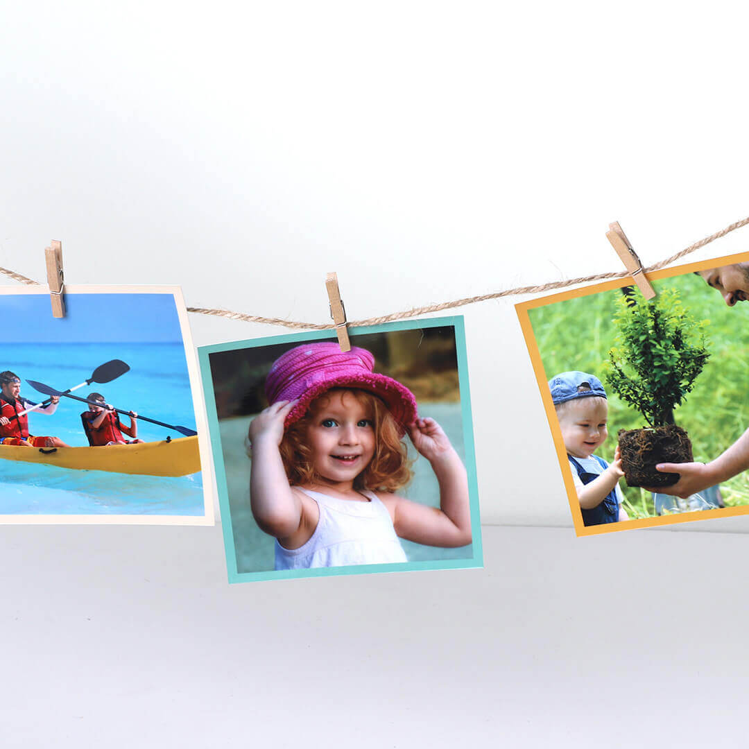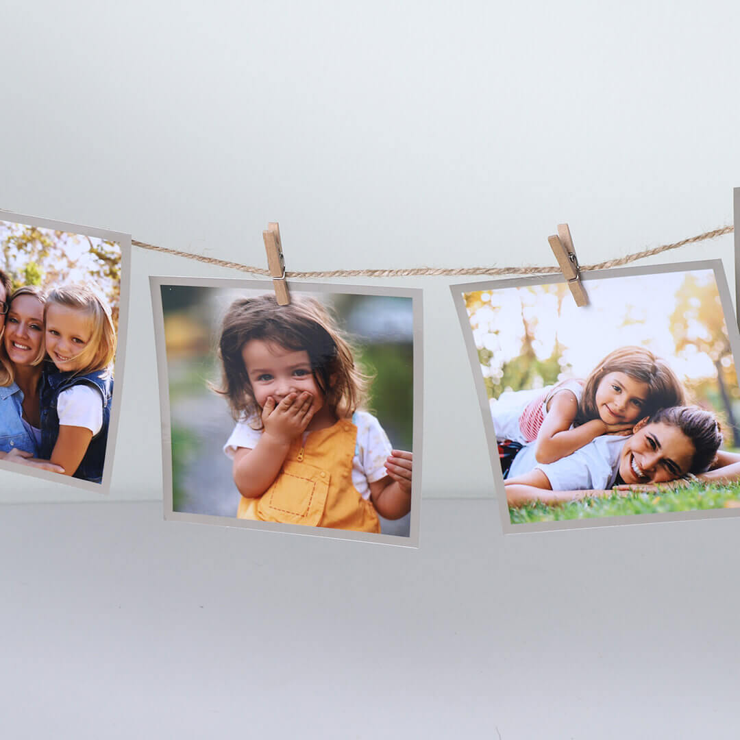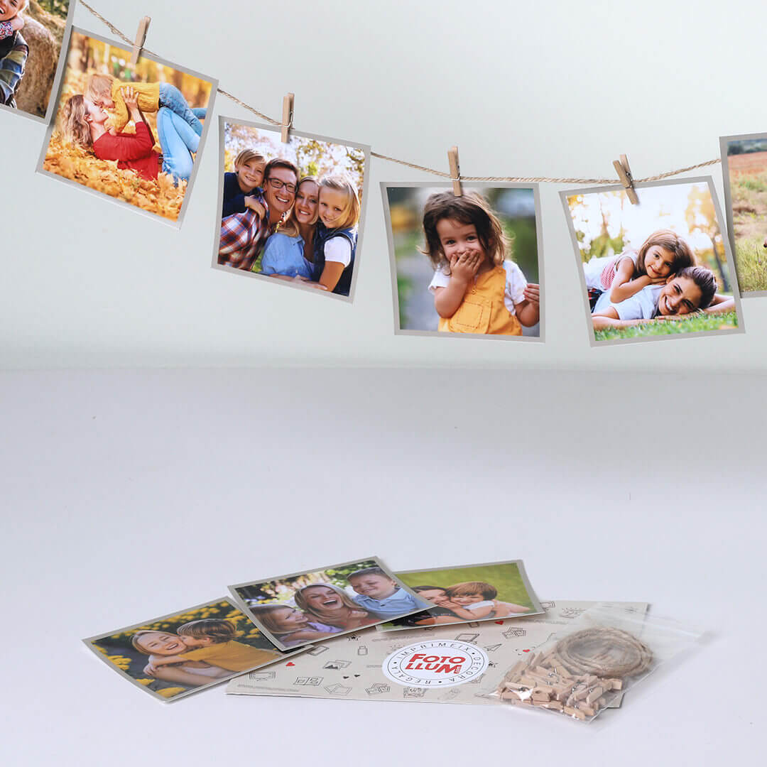 Imprime tus fotos favoritas de Instagram en formato cuadrado y cuélgalas donde quieras con las pinzas y la cuerda incluidas.